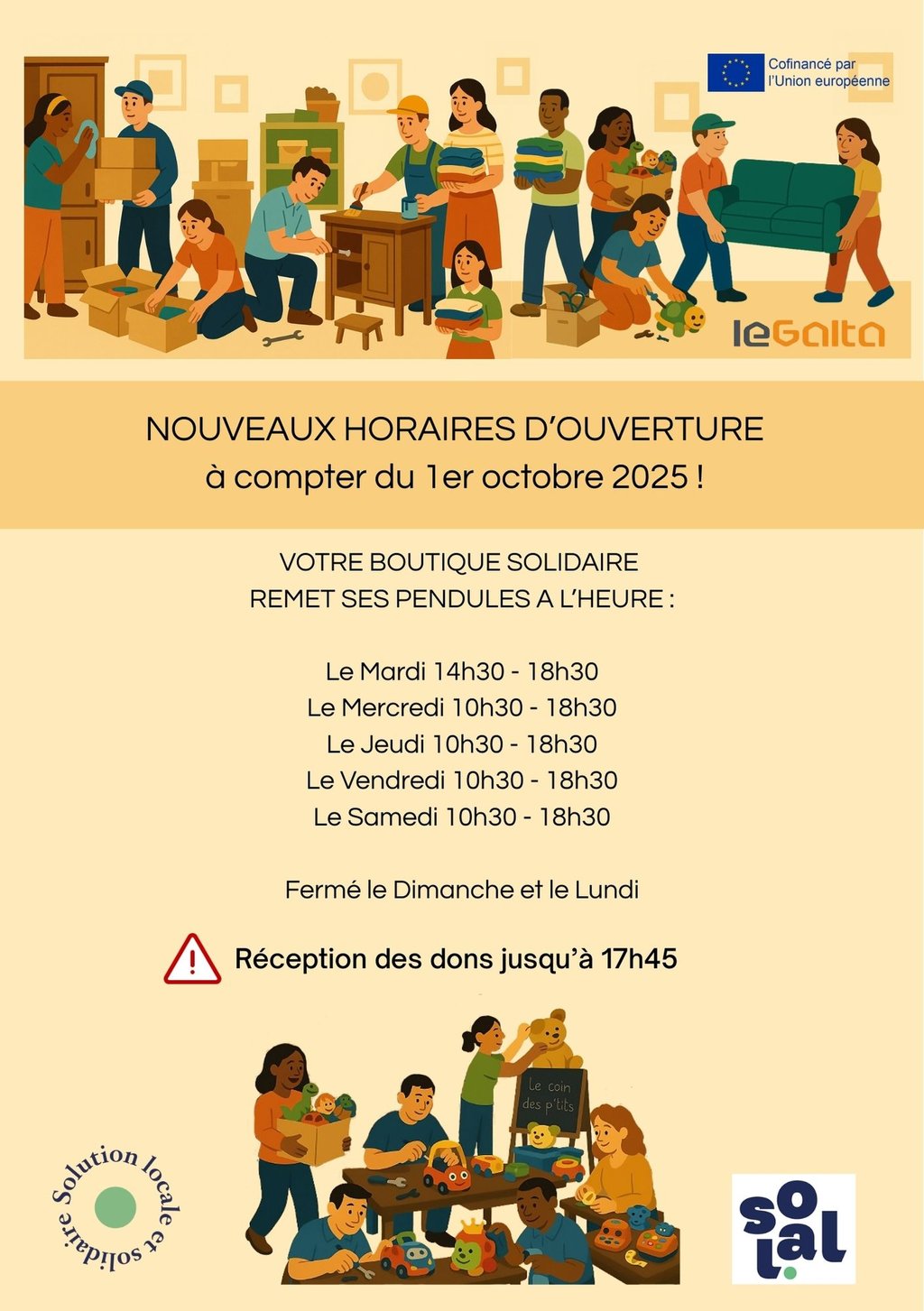 Pour mieux vous satisfaire, votre boutique solidaire le GALTA élargit ses horaires d’ouverture à compter du 1er octobre 2025 !