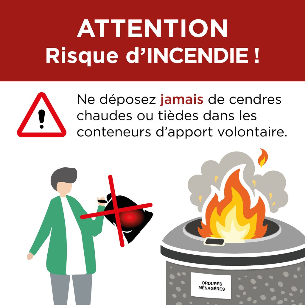 Les cendres ne doivent pas être jetées dans les conteneurs d’ordures ménagères (ni dans les autres !). Cela génère des risques d’incendies qui peuvent se propager !